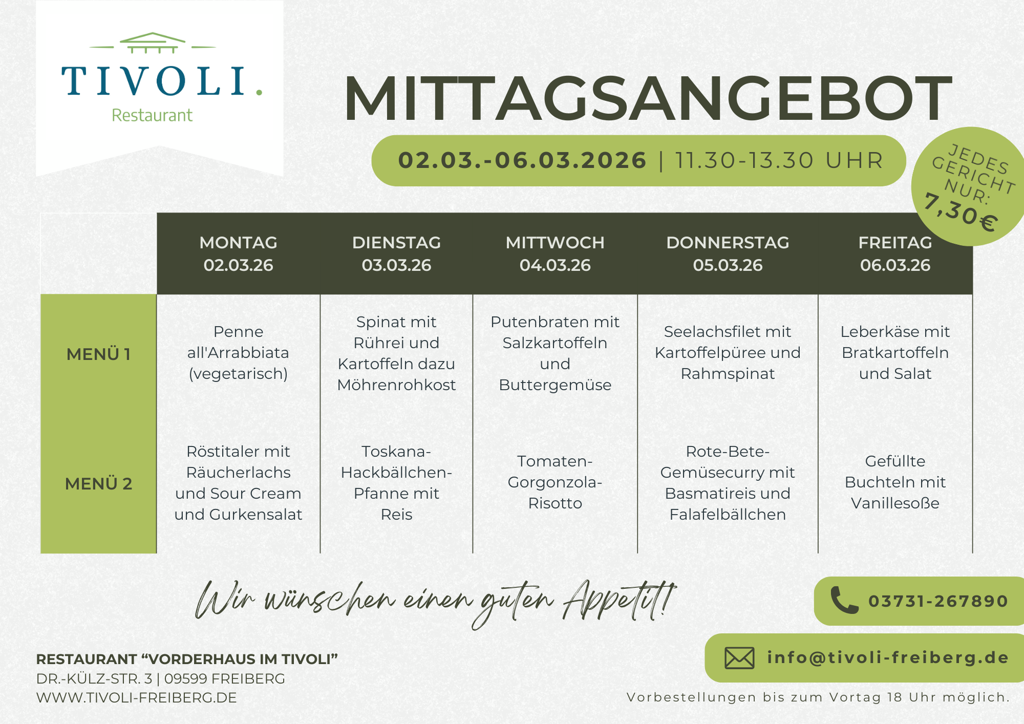 (per Mail bis zum Vortag 18 Uhr) - jedes Gericht nur 7,30 €